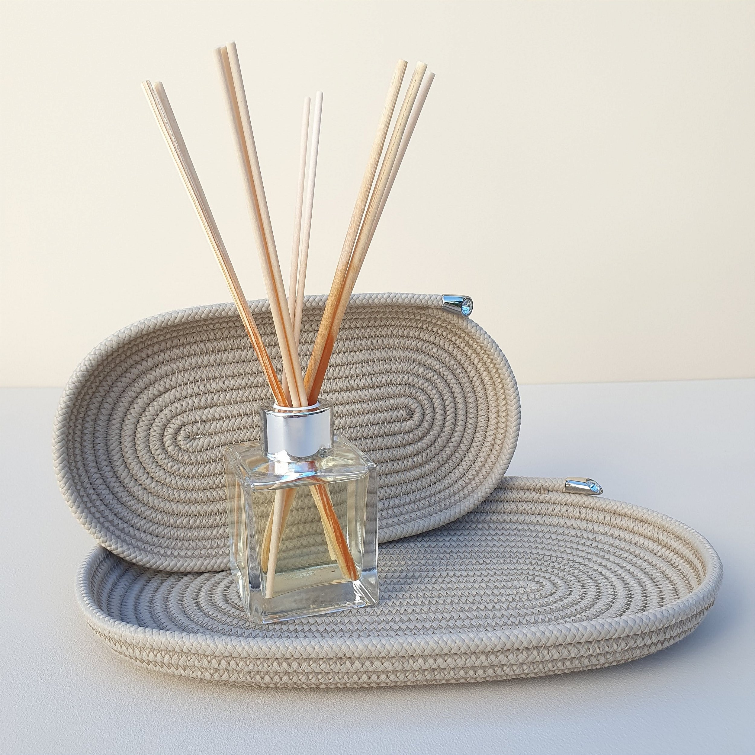 Transforme sua rotina e seu espaço com praticidade e estilo utilizando nossas bandejas costuradas artesanalmente em corda náutica. Cada bandeja é finalizada com uma ponteira na cor prata com strass, trazendo ainda mais charme e sofisticação à peça.