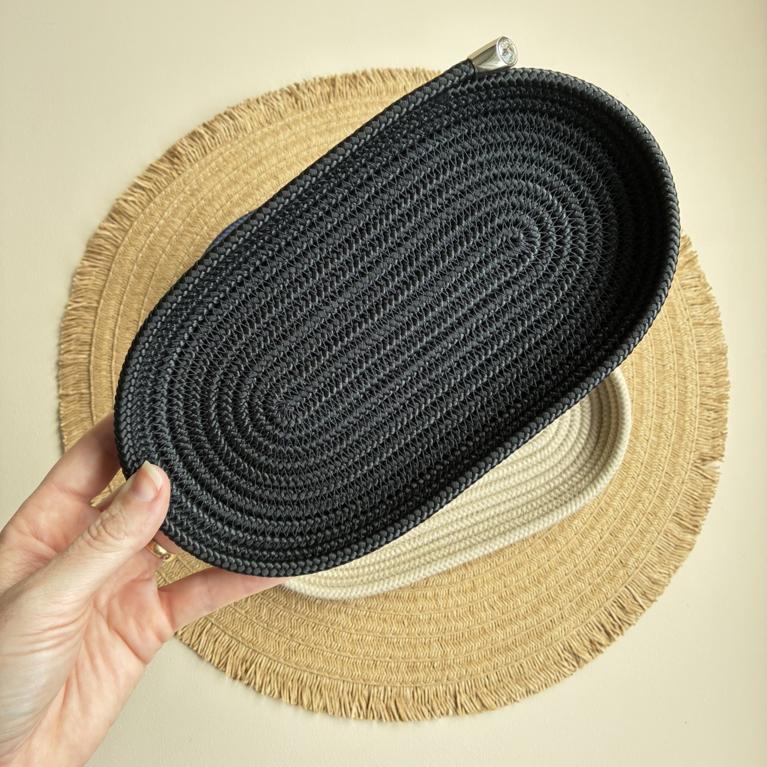 Transforme sua rotina e seu espaço com praticidade e estilo utilizando nossa bandeja costurada artesanalmente em corda náutica na cor Preta e finalizada com uma ponteira na cor prata com strass, o que traz ainda mais charme e sofisticação à peça.